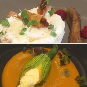 The day after the Burning of the Barrel we attending a Fireside Lunch with a winemaker. Clive’s sister and her husband accompanied us to an intimate lunch held at the Hunter Valley Resort with Steve the winemaker from Piggs Peake Wines. The food and wine was fabulous. Here’s a photo of the first and last courses – zucchini flowers and wattle seed pavlova. Yum!